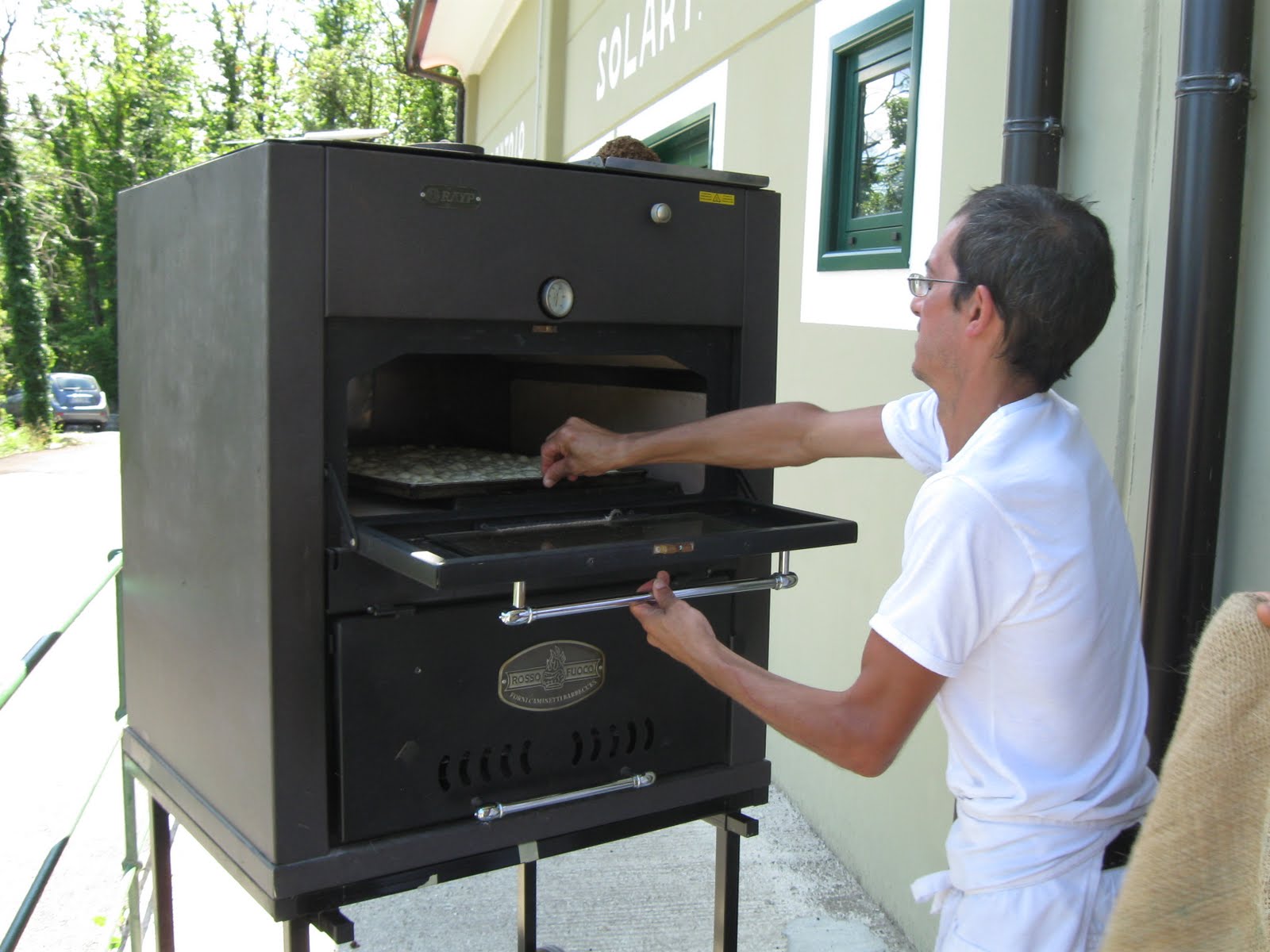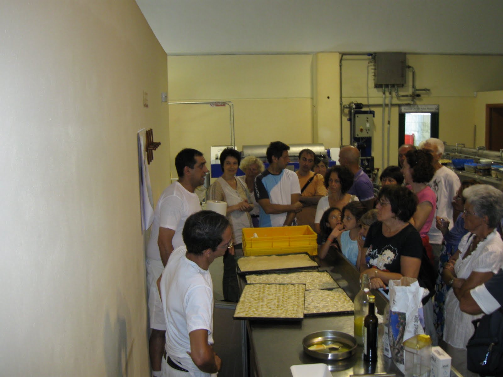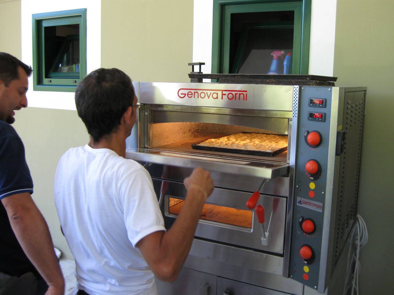 Dieci lame (teglie) rettangolari 40x60 a bordo basso, ciascuna con circa 1 kg di impasto escono alternativamente dal forno elettrico e dal forno a legna dopo una sosta di una ventina di minuti a 230°, vengono spennellate subito con l'olio di Leivi, il segreto della sua fragranza, e e nell'aria si diffonde un profumo celestiale...dopodichè la grande abbuffata! Come si fa a resistere???
